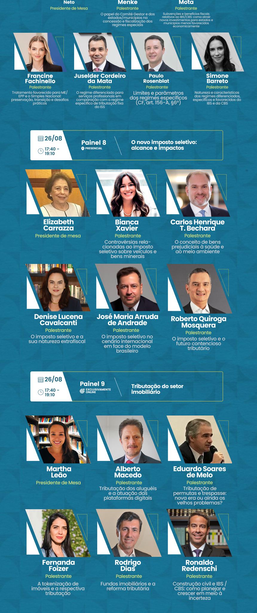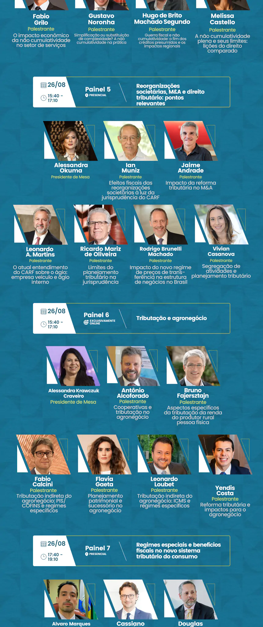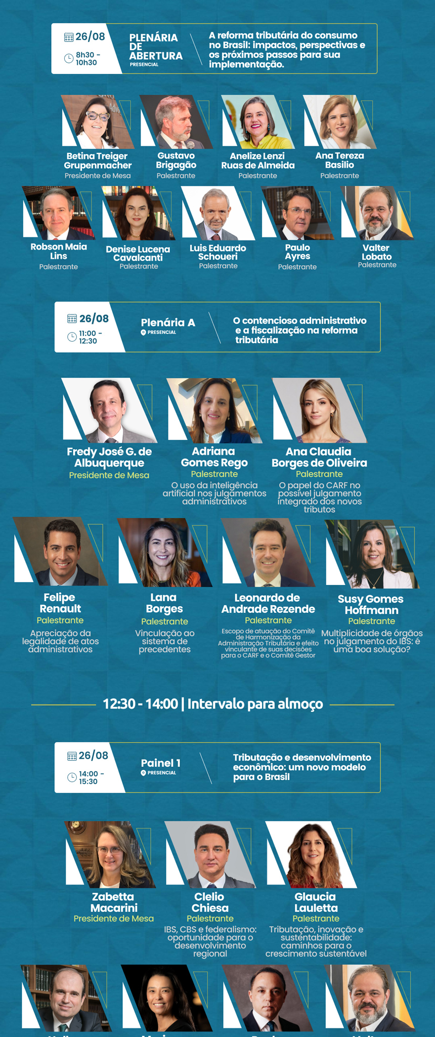 Com o tema “Atuais Desafios da Reforma Tributária”, o Congresso reunirá mais de 200 palestrantes — entre autoridades, magistrados, acadêmicos, advogados e especialistas do Brasil e do exterior — para debater os principais aspectos da reforma em curso, bem como suas repercussões legislativas, jurisprudenciais e econômicas.